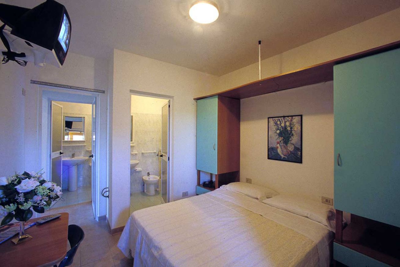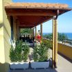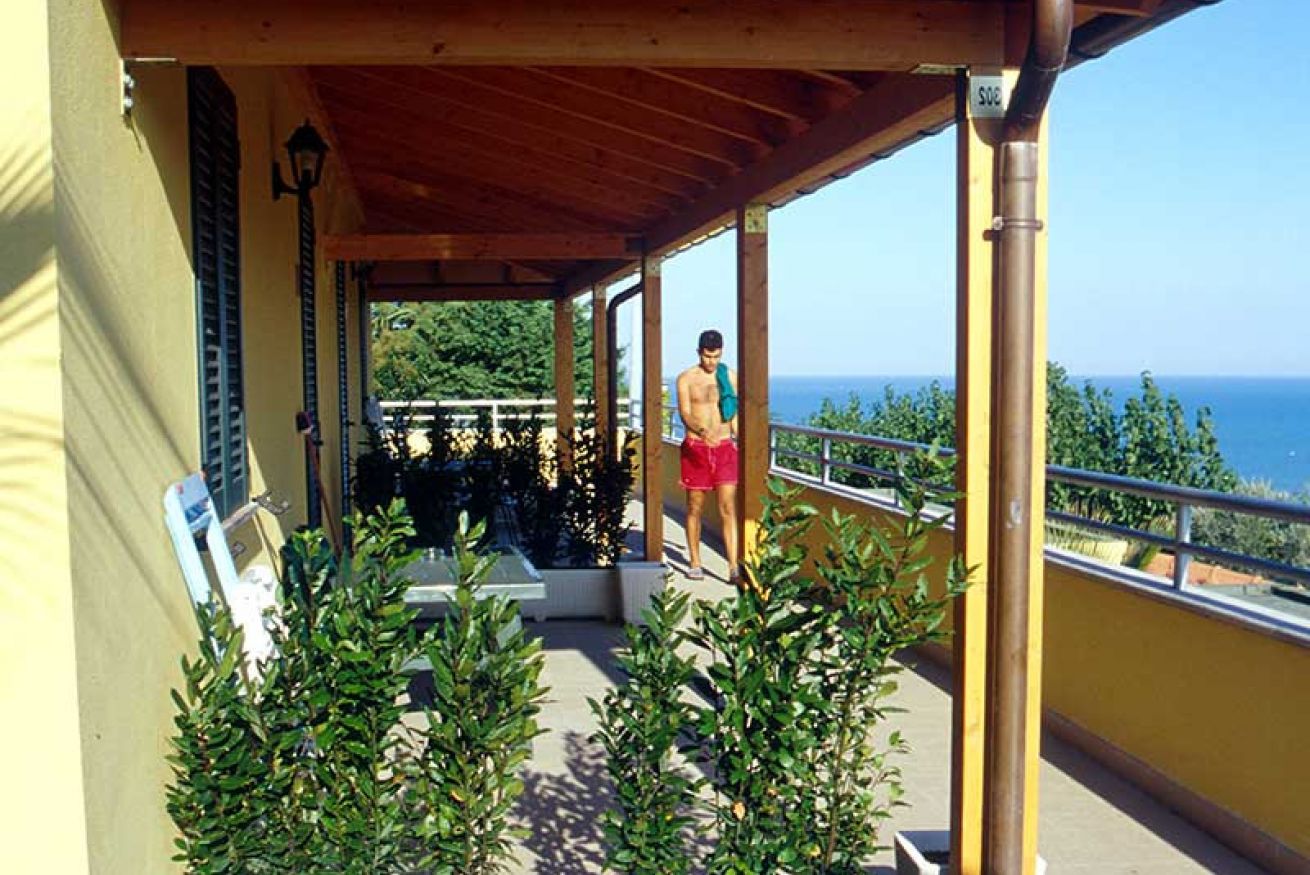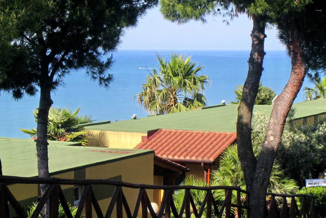 Bungalow 6 posti letto (56 mq) in muratura, vista mare, modernamente arredato, composto da 2 camere matrimoniali con possibilità del 7° posto letto per bambino, soggiorno-pranzo più letto a castello, angolo cottura completamente arredato - lavello, frigo, stoviglie, ecc., 2 bagni (WC, lavabo, cabina doccia, water bidet ed asciugacapelli), telefono, Tv-sat, 2 cassette di sicurezza, 2 verande coperte ed arredate.